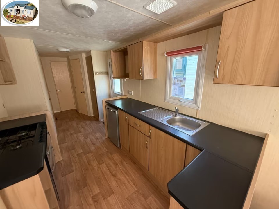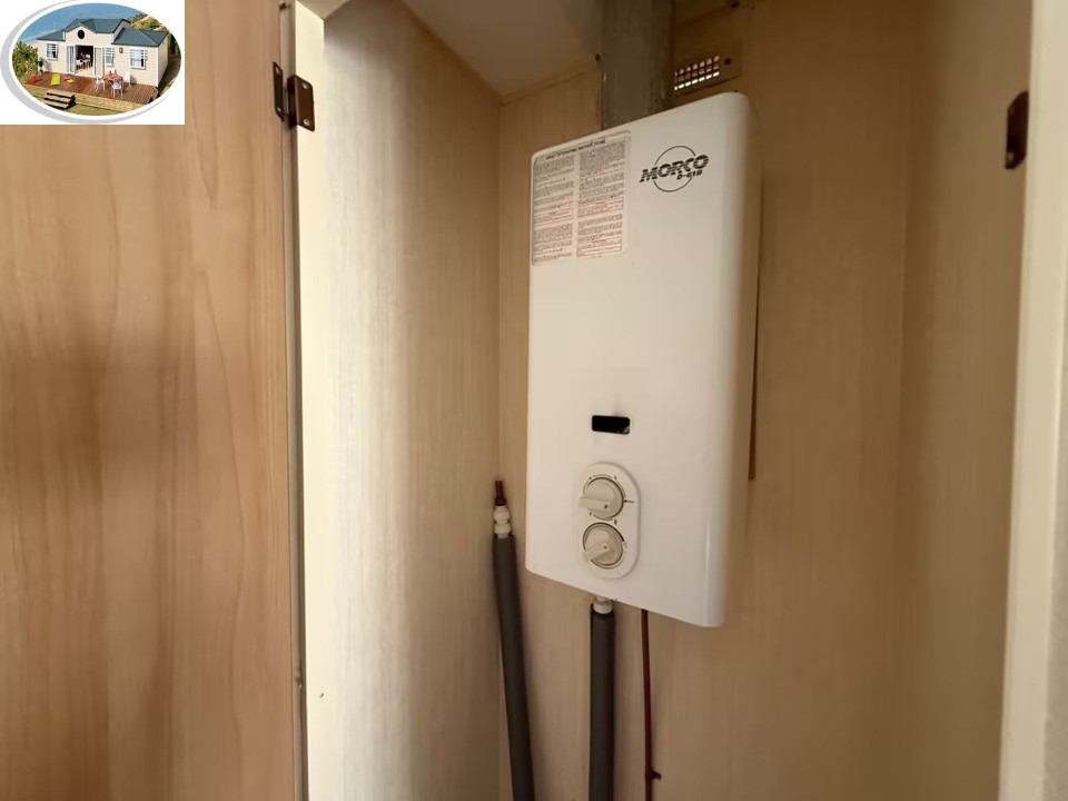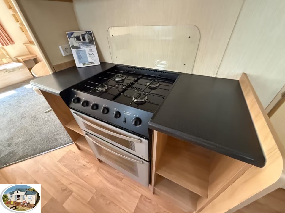 La cuisine est équipée d’une cuisinière à gaz 4 feux, d’un four, d’un grill et d’un réfrigérateur. La cuisine dispose également de nombreux espaces de rangement et d’un plan de travail.