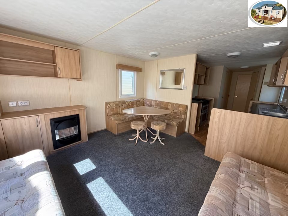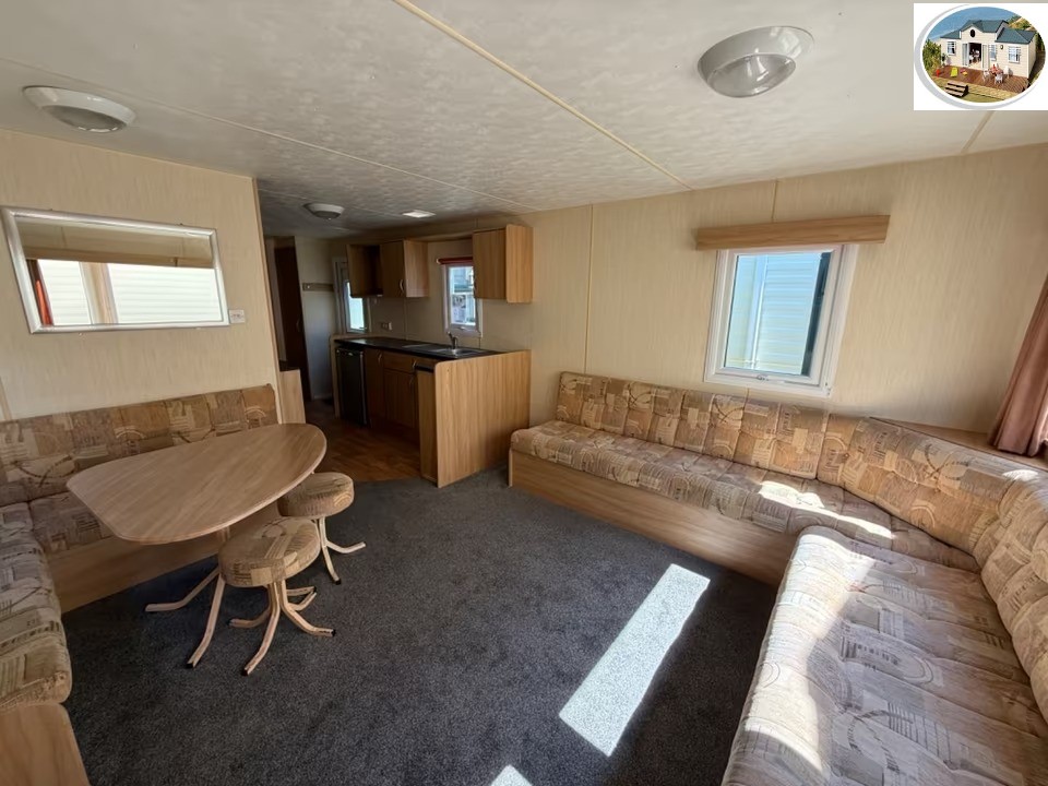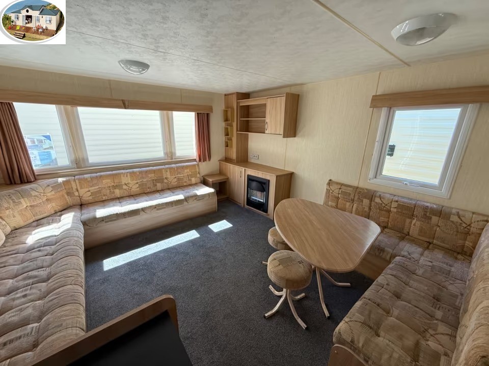 Le salon dispose d’un canapé d’angle fixe, d’un meuble TV et d’un chauffage intégré.
