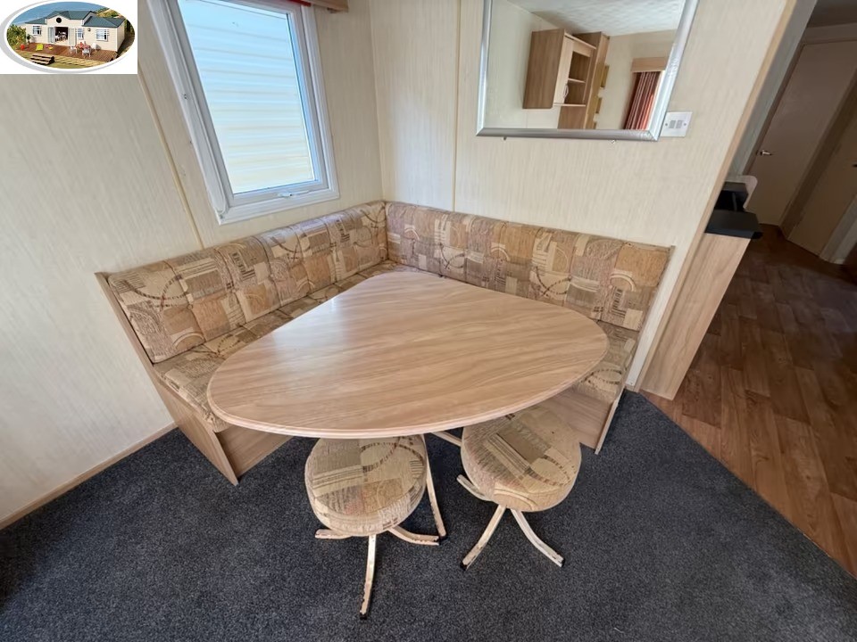 En face de la cuisine se trouve la salle à manger, équipée d’un canapé d’angle fixe, de deux tabourets et d’une table à manger.